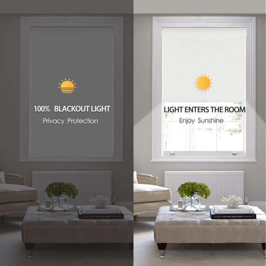 - BLACKOUT MATERIAL: This cordless window roller shade is expertly crafted with an exclusive textured fabric and a white 100% blackout backing that blocks incoming light. It's perfect for creating a comfortable and dark environment day or night. It's ideal for bedrooms, nursery, home theaters, or any room where light control is a top priority. Whether you want to improve your sleep quality or enhance your viewing experience, this blackout roller blinds is the perfect solution.